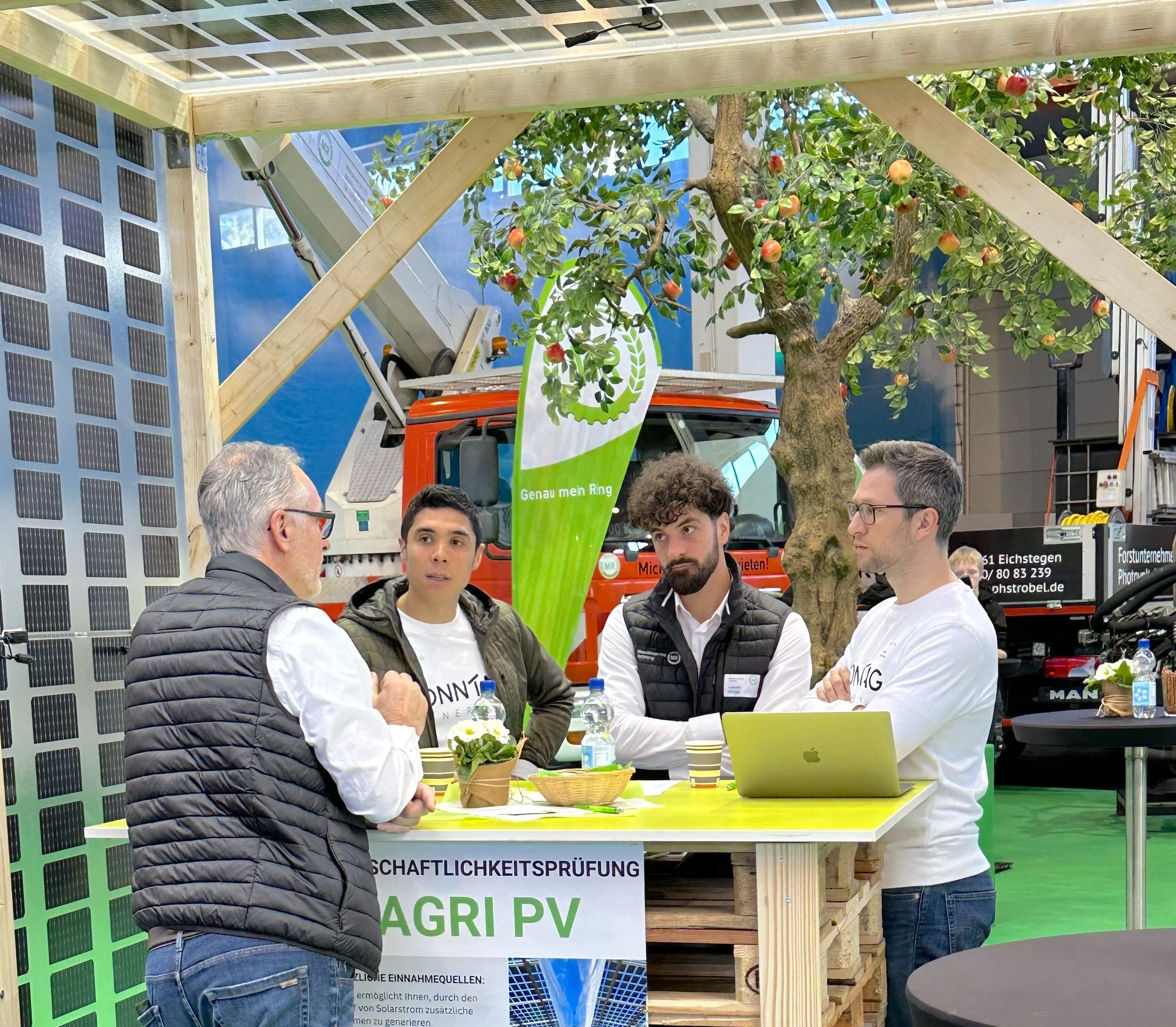 Schon nach wenigen Stunden zeigte sich: Das Interesse an Agri-PV ist enorm. Besonders unsere kostenlose Wirtschaftlichkeitsberechnung direkt am Messestand wurde intensiv genutzt. Sie war der Ausgangspunkt für viele tiefgehende Gespräche über Machbarkeit, wirtschaftliche Chancen, Vorteile, aber auch über die realistischen Herausforderungen und Grenzen moderner Agri-PV-Systeme.